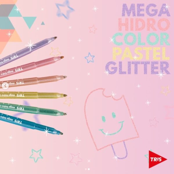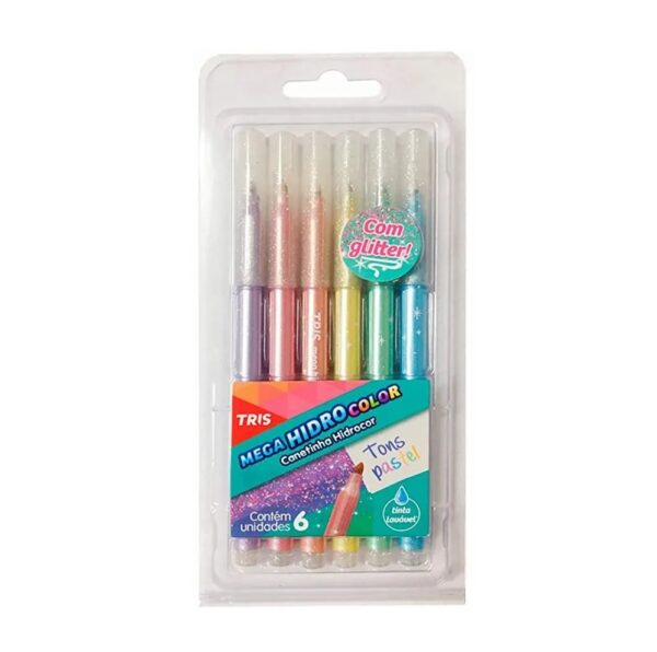 Canetinhas Hidrocores com glitter em tons pastéis.