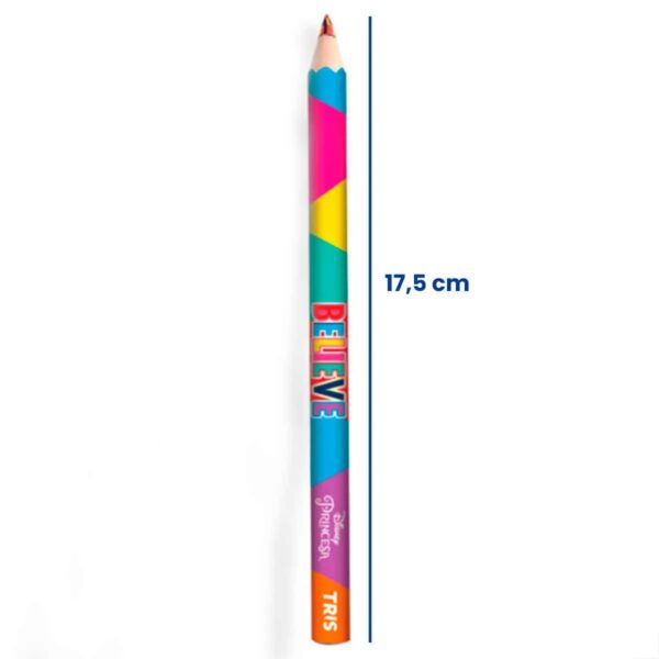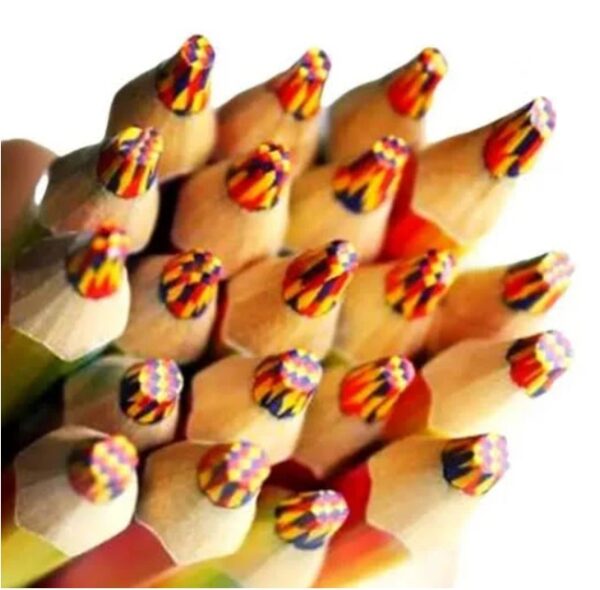 Lápis tamanho jumbo com a ponta colorida com as cores primárias (amarelo, vermelho e azul). Deixa o traço todo colorido com a mistura das cores.